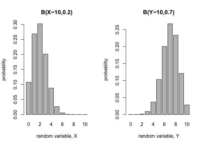 Once we know the probability distribution of a random variable we can find the expected value of that random variable, which is exactly what the name is suggesting, it is average or mean value of the random variable which we expect to find most often. Lets plot binomial probability distribution of two random variables (X and Y) with same number of trials but different p.